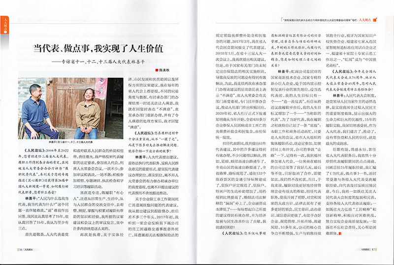 《人民政壇》:您不僅從事順昌虹潤精密儀器有限公司的經營管理,還親自參與項目的科研攻關,平時的工作就很忙,而履行代表職責也需要花費大量的時間和精力,您是如何處理二者之間的關系?