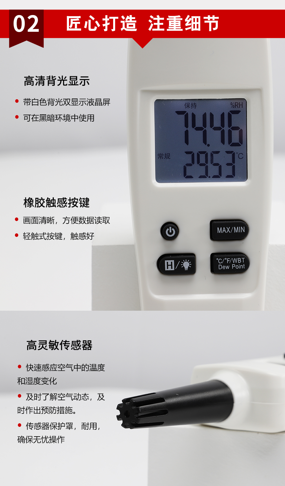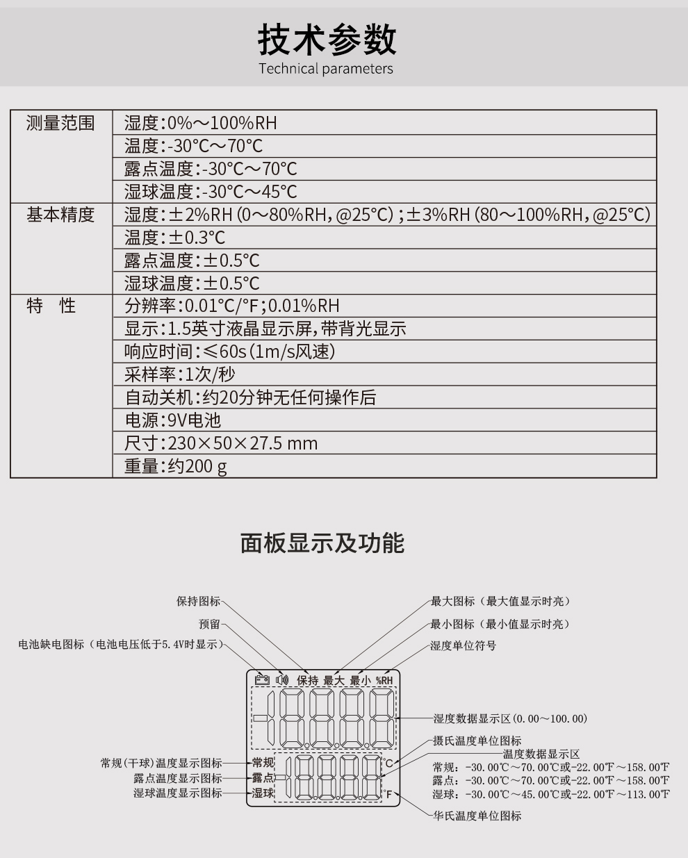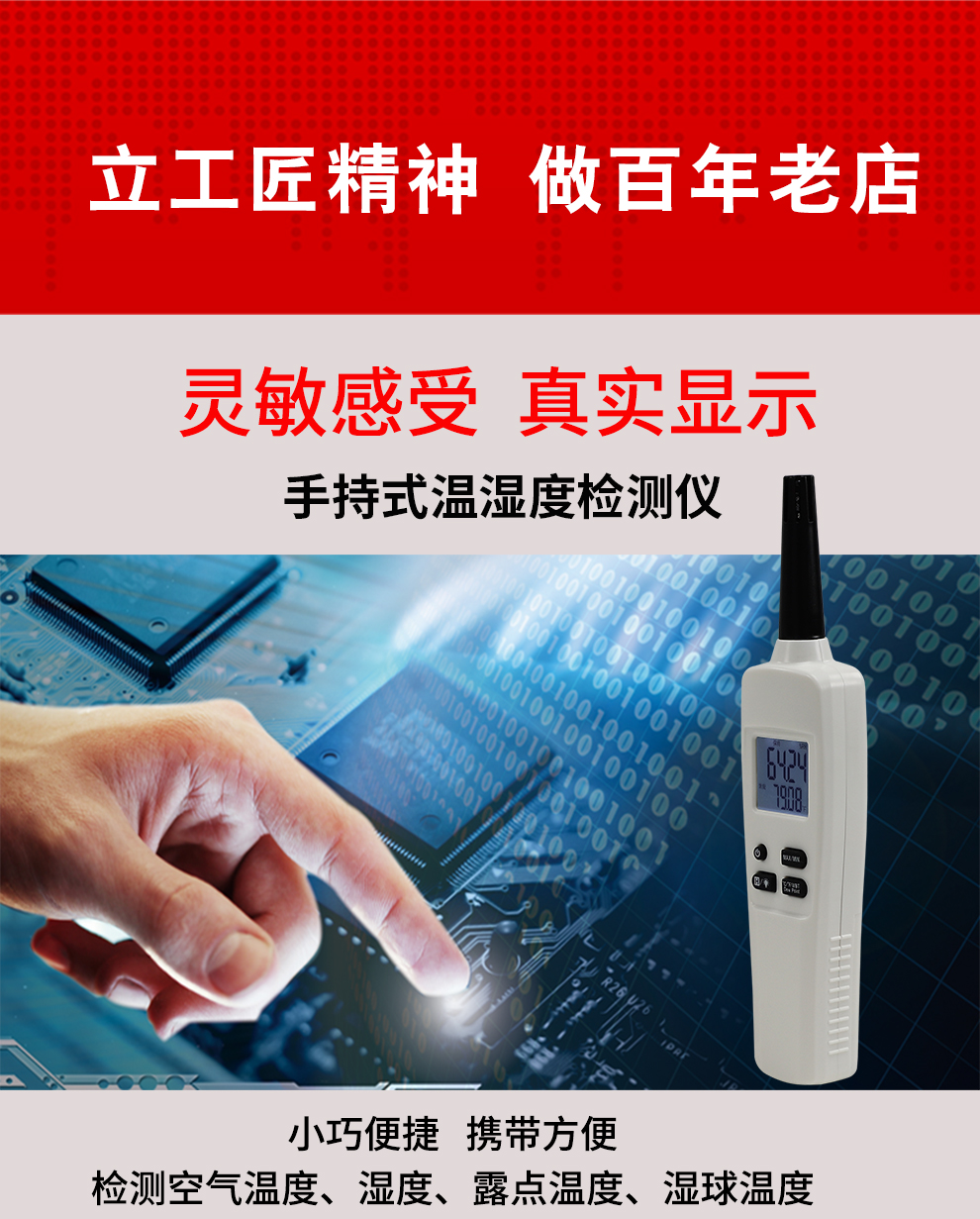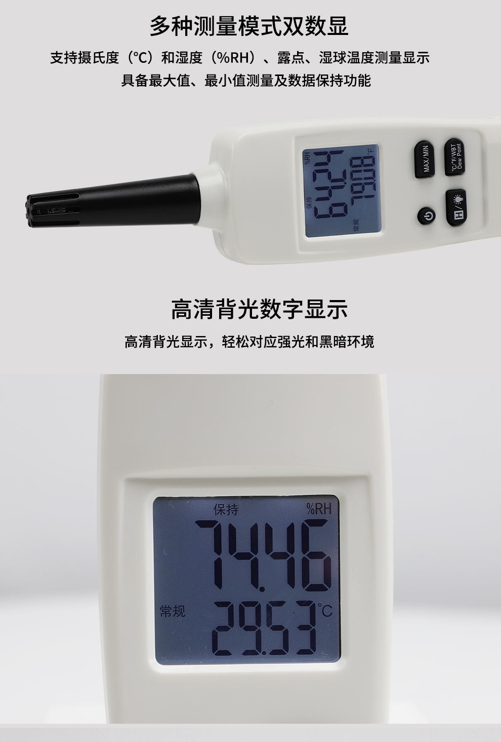 小巧便捷,攜帶方便,檢測空氣溫度、濕度、露點(diǎn)溫度、濕球溫度。