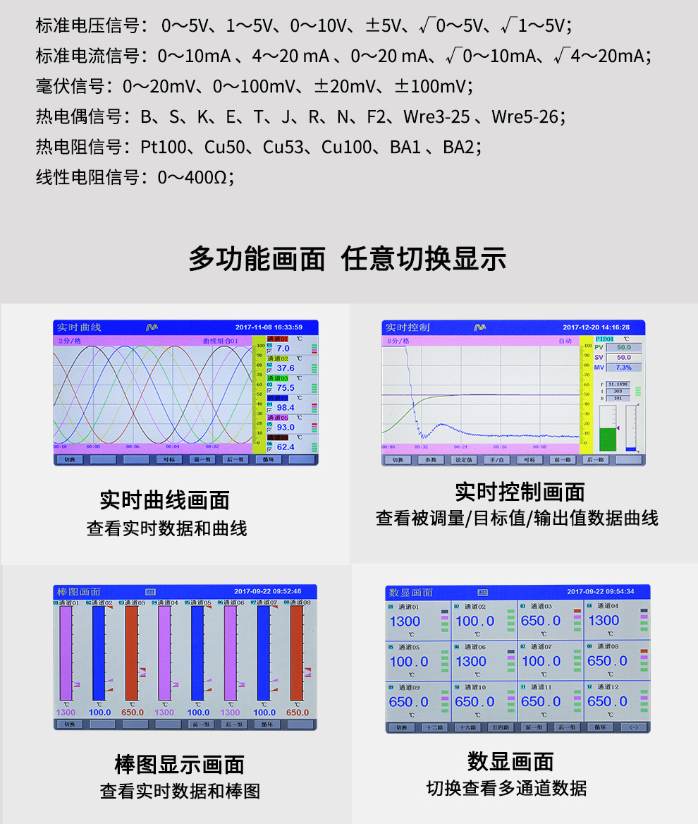 OHR-H300系列彩色調節無紙記錄儀采用真正的人工智能算式,儀表啟動自整定功能,可根據被控對象的特性,自動尋找最優參數以達到很好的控制效果,無需人工整定參數。控溫精度基本達±0.1℃,無超調、欠調,達國際先進水平。24路萬能輸入(可組態選擇輸入:標準電壓、標準電流、熱電偶、熱電阻、毫伏等)其中可帶8路控制輸入。