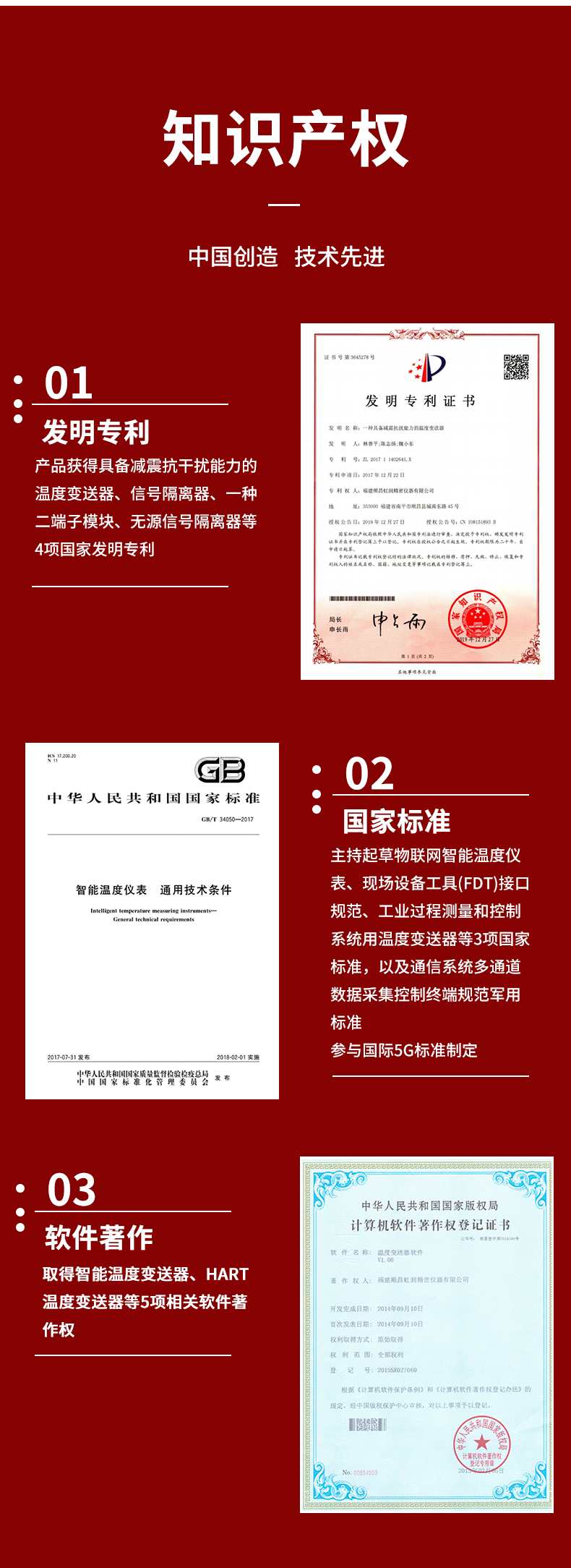 虹潤公司是專業生產溫度變送器的國家專精特新“小巨人”企業。生產的智能溫度變送器,具有適配各類溫度傳感器,精度高,穩定性好,通過編程線修改輸入信號類型及量程,高抗干擾等特點。該產品不僅通過HART基金會認證、德國萊茵 CE 認證與 SIL 功能安全認證,還獲得具備減震抗干擾能力的溫度變送器、信號隔離器、一種二端子模塊、無源信號隔離器等4項國家發明專利,主持起草物聯網智能溫度儀表、現場設備工具(FDT)接口規范、工業過程控制系統用模擬輸入兩位或多位輸出儀表、工業過程測量和控制系統用溫度變送器等4項國家標準,參與國際5G標準制定,取得智能溫度變送器、HART溫度變送器等3項相關軟件著作權。產品廣泛應用于石油、化工、電力、冶金、制藥、食品、水處理等各種工業領域。