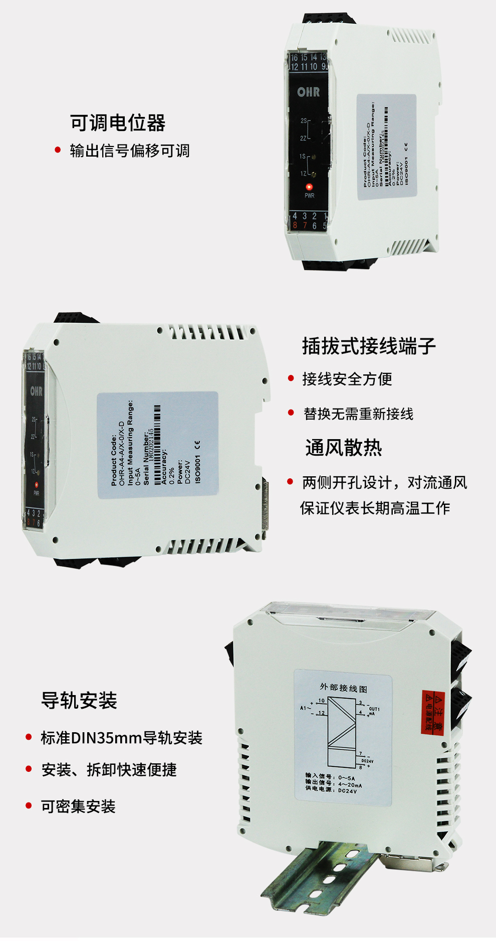 OHR-A4系列簡易型電量變送器用電磁隔離技術,對電網或電路中的交流電流、電壓進行實時測量,它可將被測交流電流、電壓轉換成按線性比例輸出的直流電流或者直流電壓信號,產品具有高精度、隔離電壓高、相應時間快、低漂移、低功耗等特點。